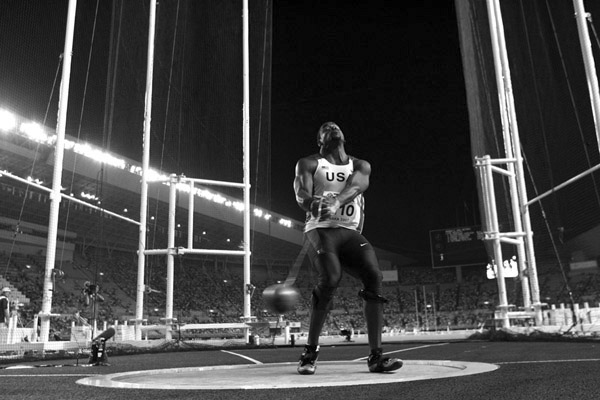 Kibwe's interesting singlet choice in 2006. L&S: I’m sure you had hoped for better results in Osaka. Can you share your experience there? KJ: Osaka was absolutely amazing. I was extremely proud with how I competed. I was unlucky on my two slight toe fouls but hey, stay in the ring, right?! In the last month of season I grew to become a better hammer thrower than I had the last season or so. My spring season competing for Ashland wasn’t as good as I wanted it to be. I was a little let down in my performance and I used that to prepare for USA Outdoors. I was happy with my performance there where I had seasonal bests on my first and last throw of the meet. From there I was going through some technical changes and that led to a personal best about a week later. That personal best led me into a silver medal finish at Pan-American Games in Rio de Janeiro, Brazil. Being that it was my first international competition ever, I was really pleased, although I knew there was more in the tank. So, I was throwing really well going into Osaka. Three-fouling wasn’t exactly what I had in mind. I took it as almost destiny. Everything happens for a reason. We protested my last throw because I didn’t feel the foul and our staff didn’t see it. So they measured it and reviewed it later (to no avail). The throw was 74.53m. This throw would have ranked me 13 th, one position out of making finals, which would have been the highest placing by an American at a major world event since Lance’s silver in Atlanta. So when discussing my experience with Jud and the staff in Osaka, I was happy and ready to tackle my fall training! I also had some very kind words of encouragement from Tore Gustafsson and Koji Murofushi. They gave me additional technical expertise and just overall advice. I used this along with Jud’s critique for the base of my fall training. My experiences in Osaka led me to my best fall training yet and put me on track for some big throws this Olympic season.L&S: I’ve been to Ashland and it’s not exactly a diverse, vibrant metropolis. What’s to do when you’re not training? KJ: Well you are right about that. But what Ashland does have is the training group and the fact that everyone shares the same common goal at being the best we can be at our events. So, when not training, we watch a lot of movies on our sweet new flat screen. Crystal and I joke that we treat the TV like our kid. We also play a lot of Guitar Hero and Rock Band. Most of the time when I’m not training, I just find myself daydreaming about the hammer. I think I have a problem…. L&S: If you could be Olympic gold medalist in either the disc or hammer, which would you pick, and why? KJ: I’m pretty sure I would pick the hammer. Discus is my first love, but I am just in love with the hammer lately. I love the history of it and I especially love the challenge that we face as Americans in today’s track scene of producing guys who can compete on the world level and push for medals. I like, and can really appreciate, where our discus guys are going right now. I want to lead the way to take U.S. men’s hammer where discus is now, and eventually for both to dominate on a world level as the shot does. The groundwork has been laid with our youth, juniors and me personally, I’m still pretty "young" in this hammer game. I got my first taste of being on a podium in front of a packed stadium in Brazil. I want that Olympic medal! L&S: Do you have a preference between the weight and hammer? What do you consider to be the major technical differences between the two? KJ: My preference is the hammer. I am personally not that big a fan of the weight. I had never thrown it until I moved to Ashland. I never liked it because it hurt my body too much to throw it, and I threw it poorly. It doesn’t hurt my body anymore, so now instead it is a reminder that it isn’t outdoor season yet and its 0 degrees outside for the hammer, which is always fun. The weight can be a vital tool in training for the hammer, but it must be thrown like the athletes’ hammer technique. I trained in practice with four turns this last season but just couldn’t get my timing down once the adrenaline got going on meet day. This bodes well though because I threw the weight much farther in training off of four turns than I did off of three. L&S: Can you give us some specs on yourself? KJ: 6’2" 232/105k Bench – 390/177k Back Squat – 595/272k Front Squat – 425X3/192k Dead Lift – 655/297 Push Press – 315/143k Behind Neck Jerk – 390/177k Clean – 385X2/175k Incline Bench – 325X2/147k Snatch – 286/130k Quad test: 3 Hop – 9.90m Overhead shot – 19.94m Standing long jump – 3.44m 30m – 3.54 L&S: What does/would a perfect hammer throw feel like? KJ: The perfect throw as I see it in my head 30,000 times a day starts with the hammer feeling super light on my cast going into the winds. The rest would be kind of a blur. I would have an easy, solid first toe turn with a smooth transition to the heel and the ridiculous counter accelerating the ball at stupid speeds for four turns until it just "leaps" out of my hands and I yell for about seven seconds before the ball hits the ground. P.S., seven seconds would be like a 94 meter throw. No big deal. Of course, this is all totally hypothetical, I’m not sure what it would feel like, but it’s something that I strive for everyday. L&S: Name three things a throws fan wouldn’t know about you. KJ: I try to be as open as possible so I think the only things most people might not know are what my name means. Kibwe is Swahili for "stone". However, a couple years ago Crystal found out from her cousins’ Kenyan wife that in a different dialect of Swahili it meant "big fox". My favorite band is Outkast. The majority of my immediate family all graduated from California-Berkeley. Go Bears!